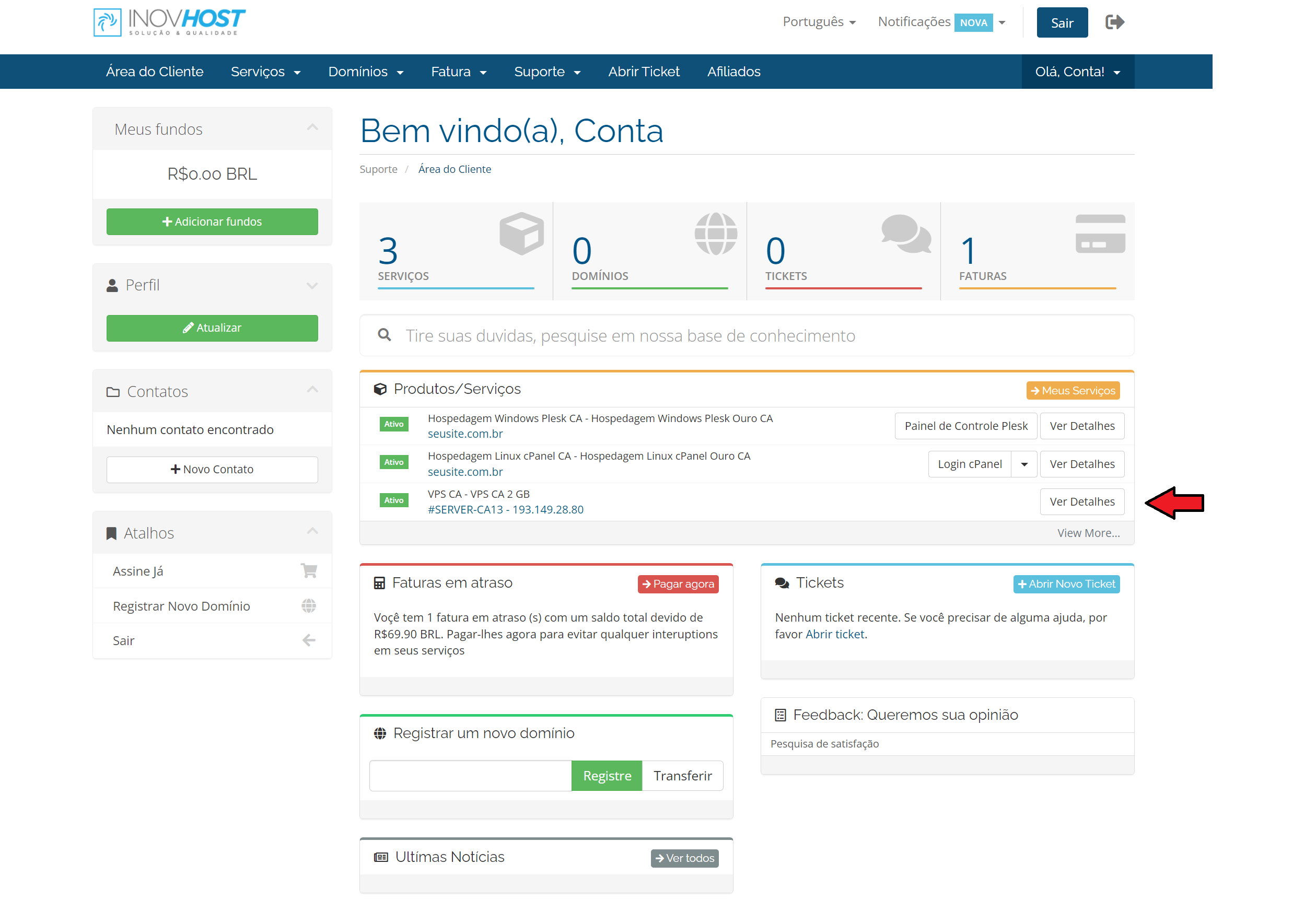 Acesse o portal do cliente pela URL: https://cliente.inovhost.com/clientarea.php?action=services.